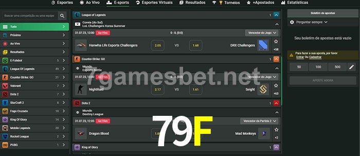 O 79F oferece uma grande seleção de opções de apostas em e-sports com probabilidades competitivas